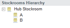 To illustrate the issues, let’s use a simplified central warehouse, called “Hub Stockroom,” which has 2 places to keep inventory. We’ll call them “A” and “B”. Both A and B are stockrooms themselves, and both have the Hub Stockroom as their parent. In this example, we’ll say there’s a laptop in section A: